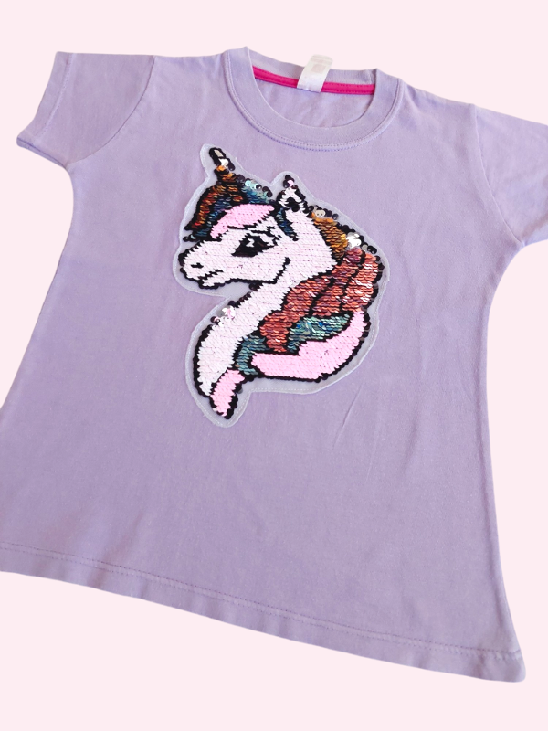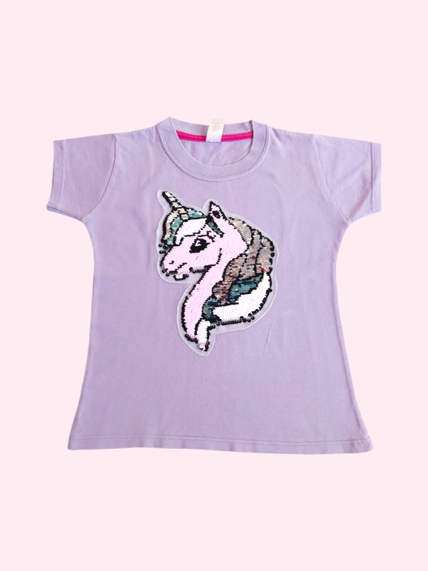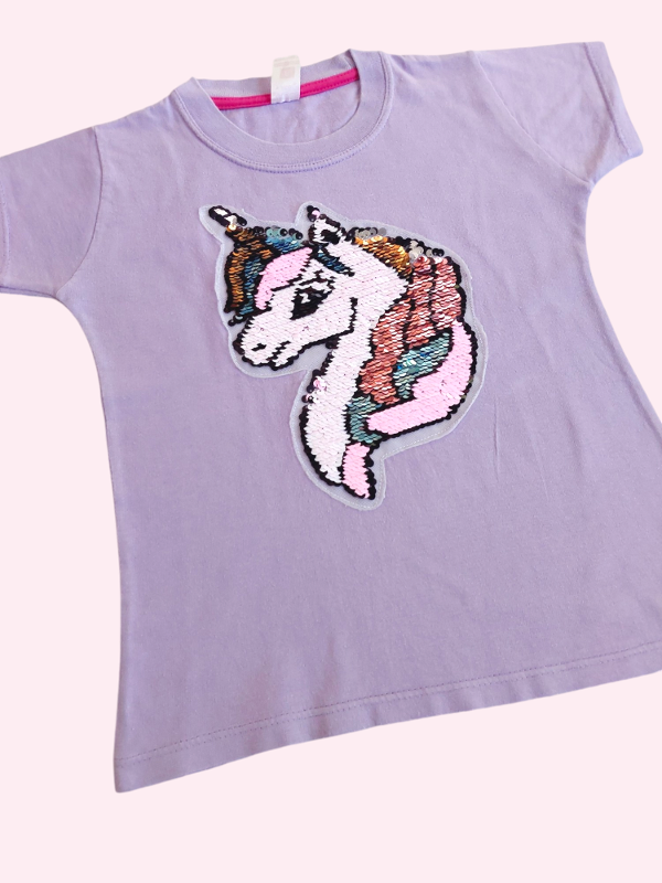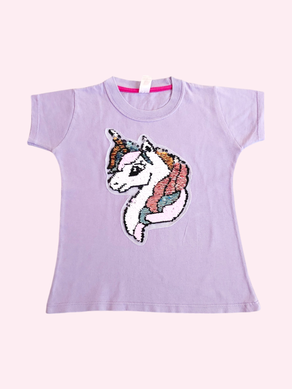 Remera manga corta lila con unicornio de lentejuelas 4/5 años