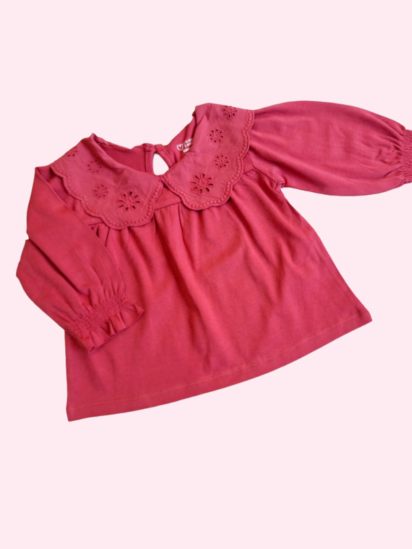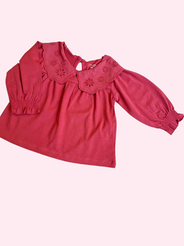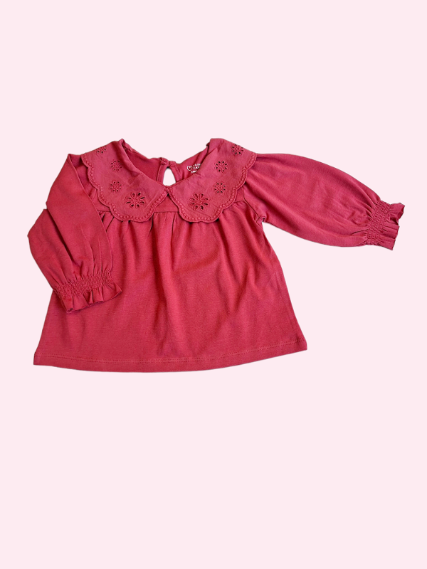 Remera manga larga bordo de algodón con cuello broderie Primark 6/9 meses