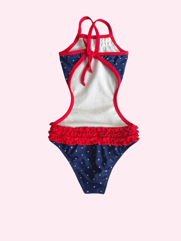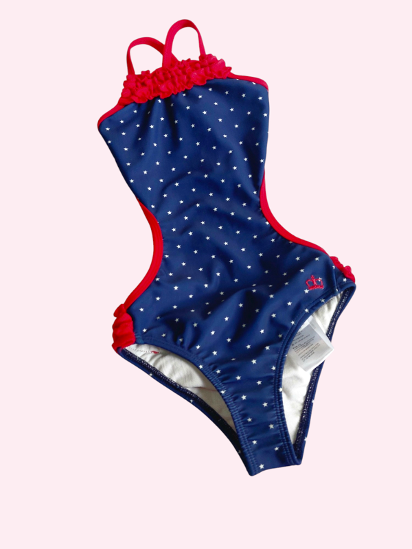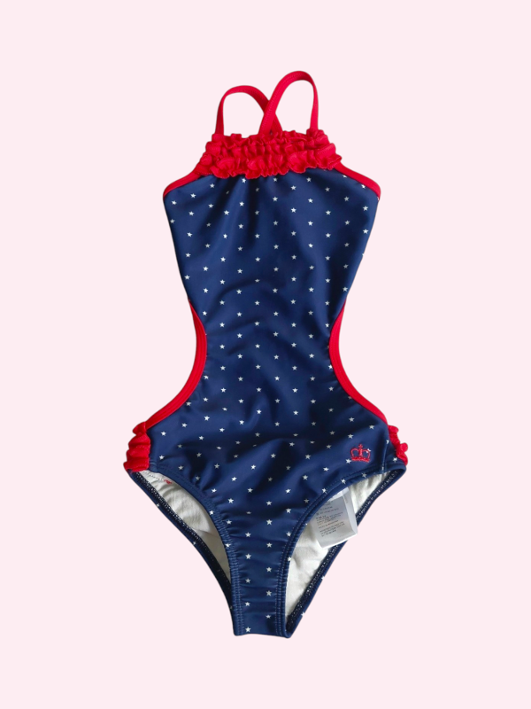 Trikini azul oscuro con estrellas y volados rojos Paula 18/24 meses