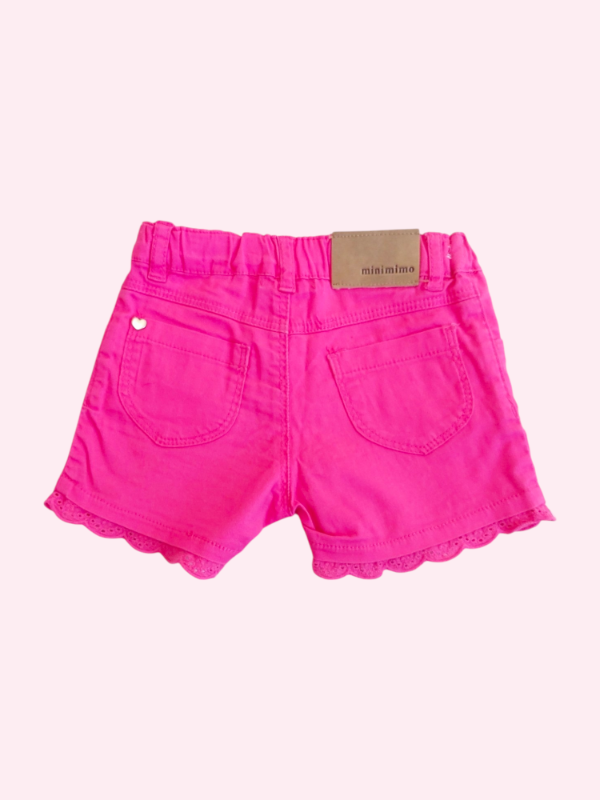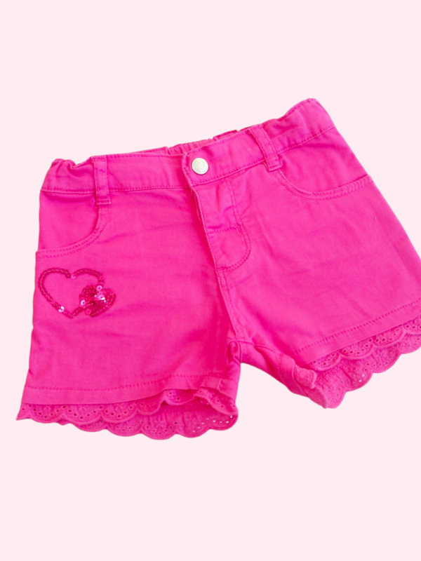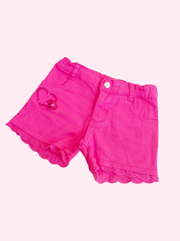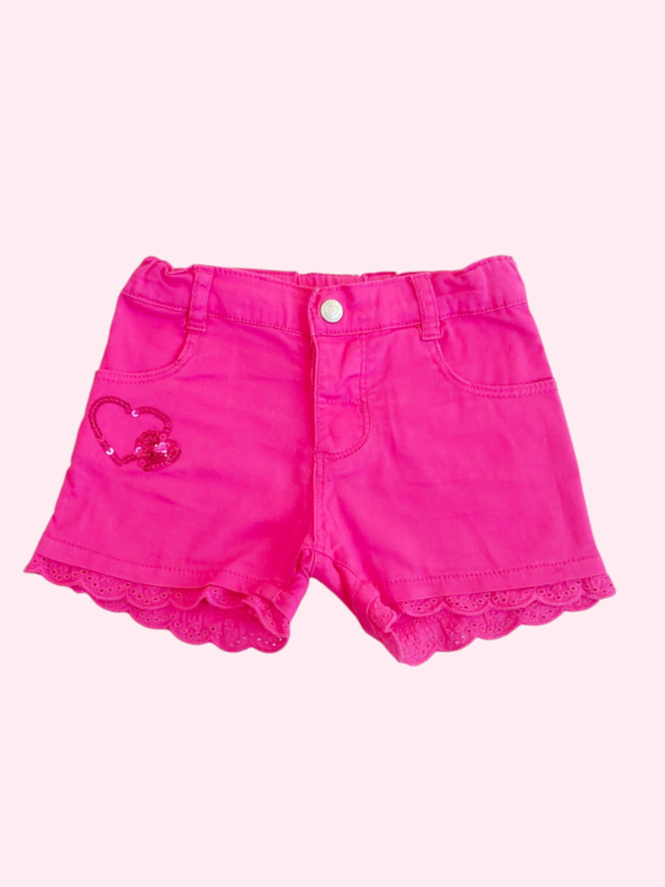 Short de gabardina fucsia con puntillas y corazón lentejuelas Mimo 6/9 meses