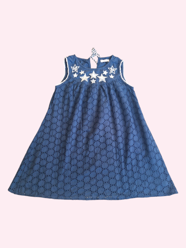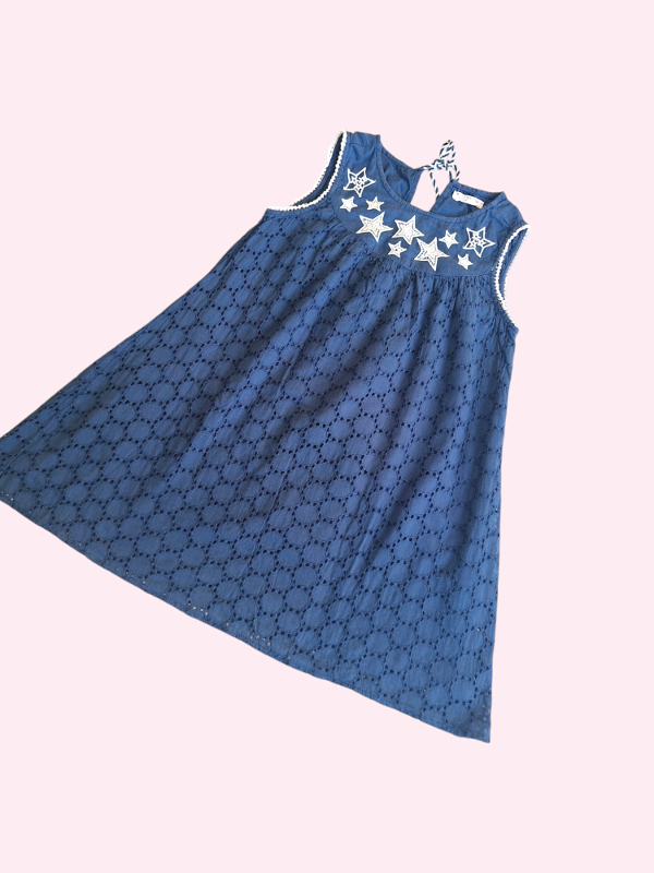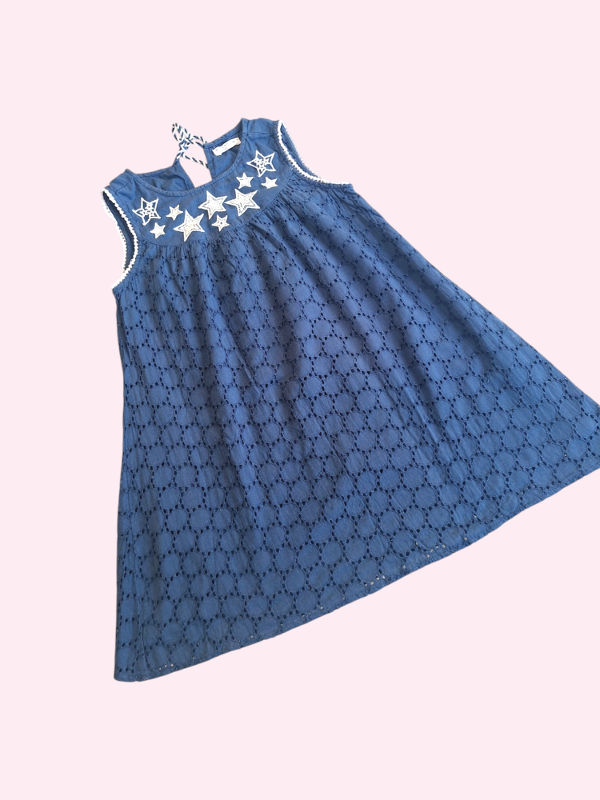 Vestido sin mangas azul con blanco de broderie Wanama 8 años